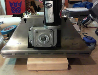 I also started to put together the mechanics of the foot drives. The foot drive frame is an old JAG frame which came with the wheels, pulley belt, and keyed gears. I got the NPC motors from the Robot Marketplace.com. I used to get all my old battlebot motors from there. These are much smaller and were much cheaper! 🙂