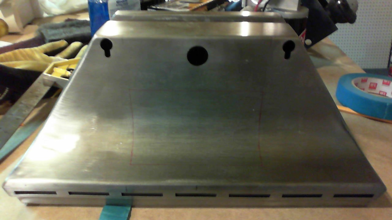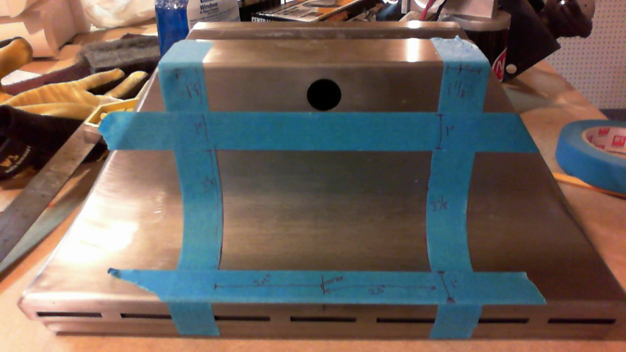I used a combination of the dremel and the pneumatic metal saw to cut out the box. The tape was just used to create straight lines . I drew a fine sharpie line on the inside of the tape and pulled the tape off. I ended up using one dremel cut off wheel for each side of the rectangle. The pneumatic saw worked too, but it was too slow.