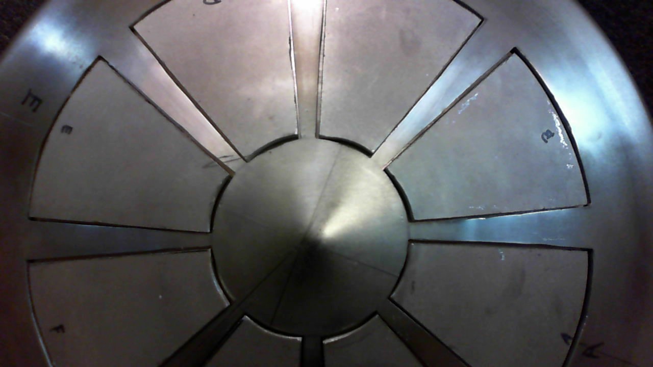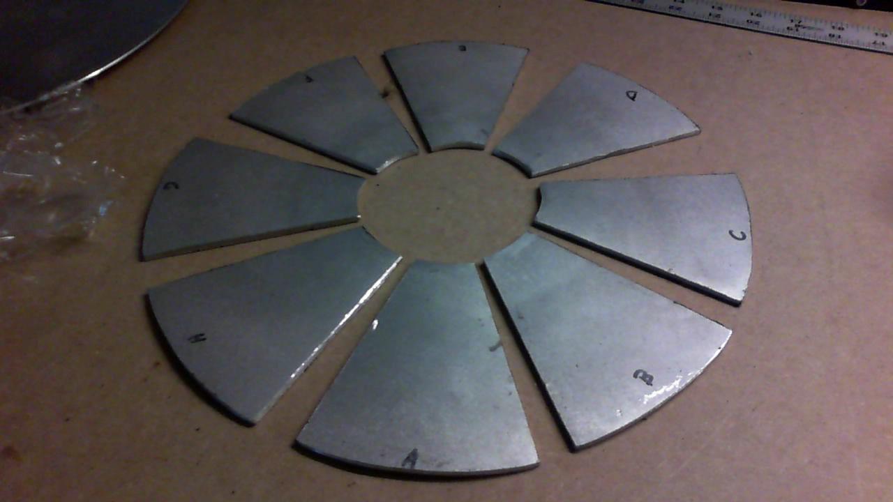 The pie pieces were cut using a dremel rotary carbon fiber wheel to make an initial cut through the aluminum. Then I used a pneumatic metal saw to cut the lines. It was important to try to cut these straight, because the only scrap is the cut aluminum lines. The inner pie pieces will need to go back in the dome.