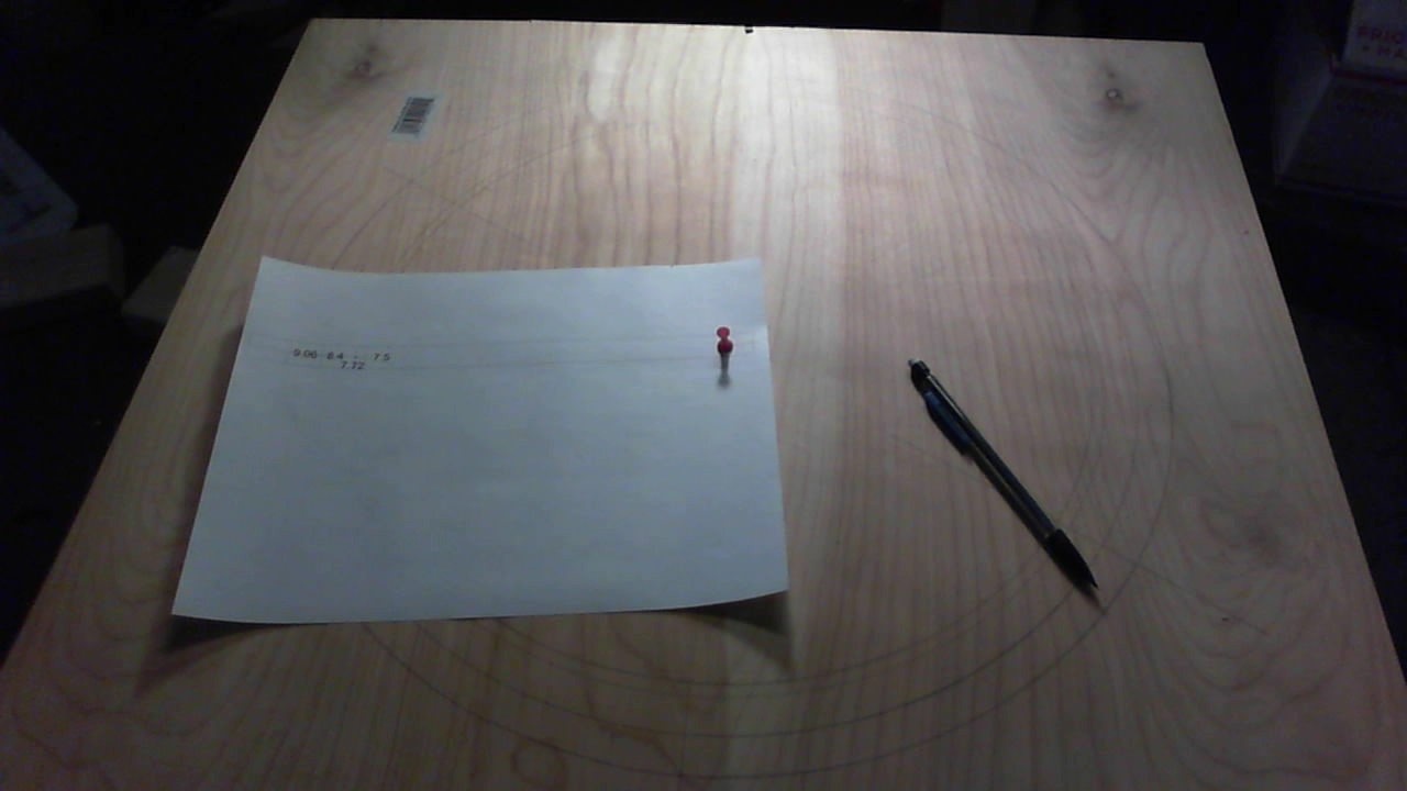 So here are some shots. This is my make-shift compass. Since I knew I couldn’t measure the diameters accurately using a ruler, I drew boxes in Powerpoint at the precise dimension I needed. The powerpoint looked something like this. The 7.5 was the inner radius, the 7.72 was the bolt location and the 9.06 was the outer radius. I took a thumbtack and put a hole in the right intersection and a small hole on the left “cross-hair”. I stuck the thumbtack on the right intersection and stuck a pencil in the location where I wanted to draw a circle. The picture below shows how I did this.
